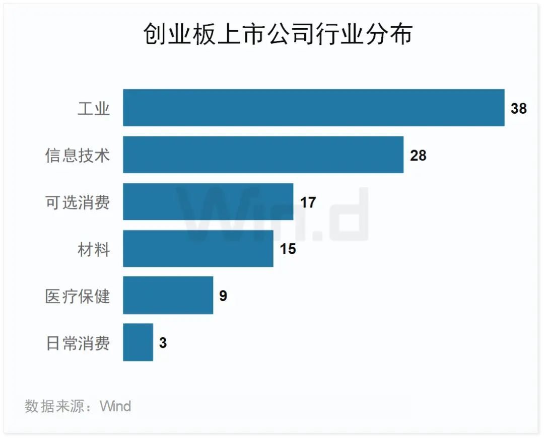 2023年发行的110家创业板公司主要分布在6个Wind一级行业中,其中工业行业以38家位居首位,其次信息技术、可选消费和材料行业,发行数量均超过10家。