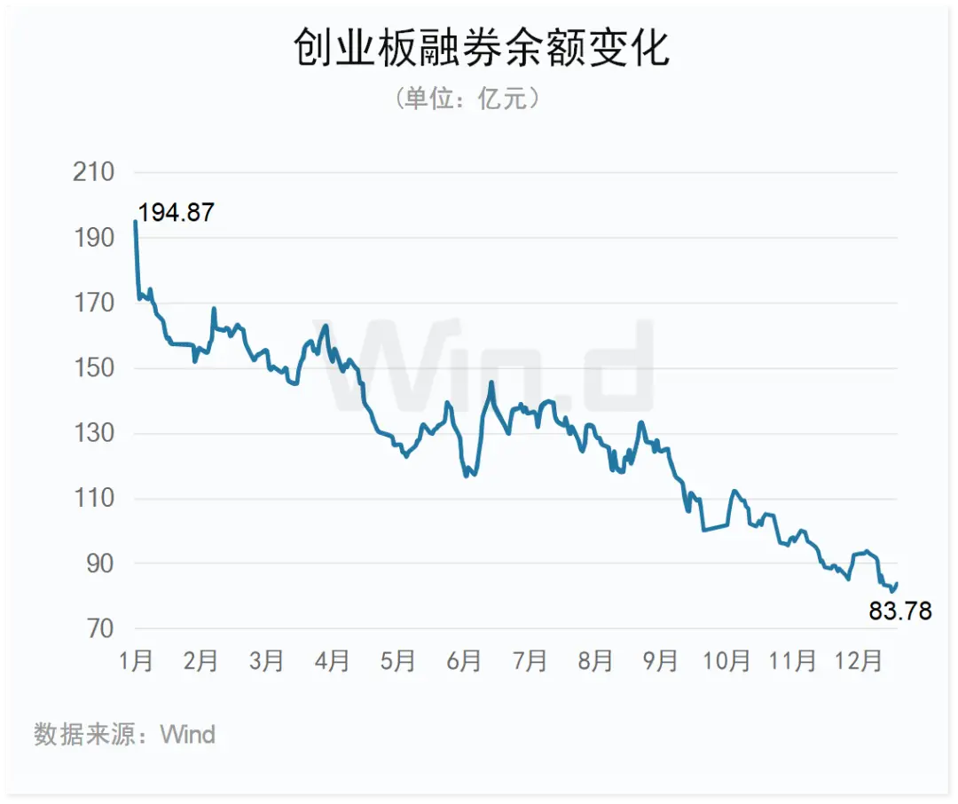 2023年末,创业板融券余额为83.78亿元,较年初大幅减少111.09亿元,全年融券卖出量持续减小。