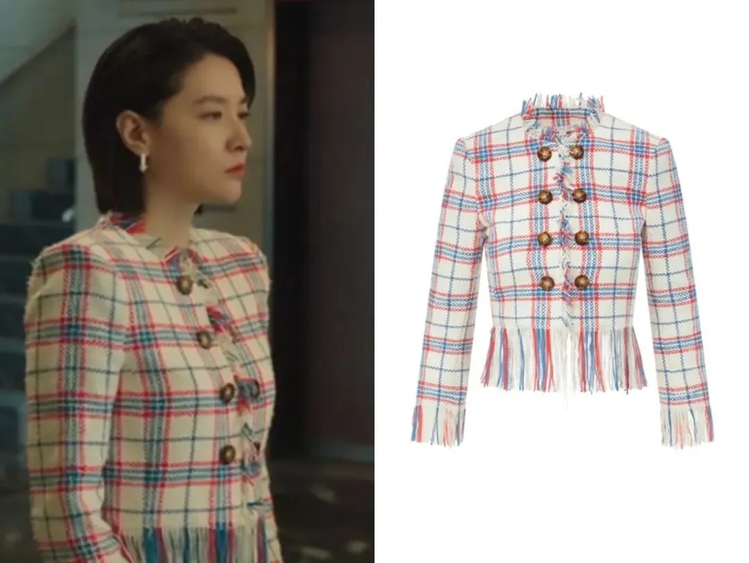 这件花呢外套来自Veronica Beard,编织流苏还蛮别致的。