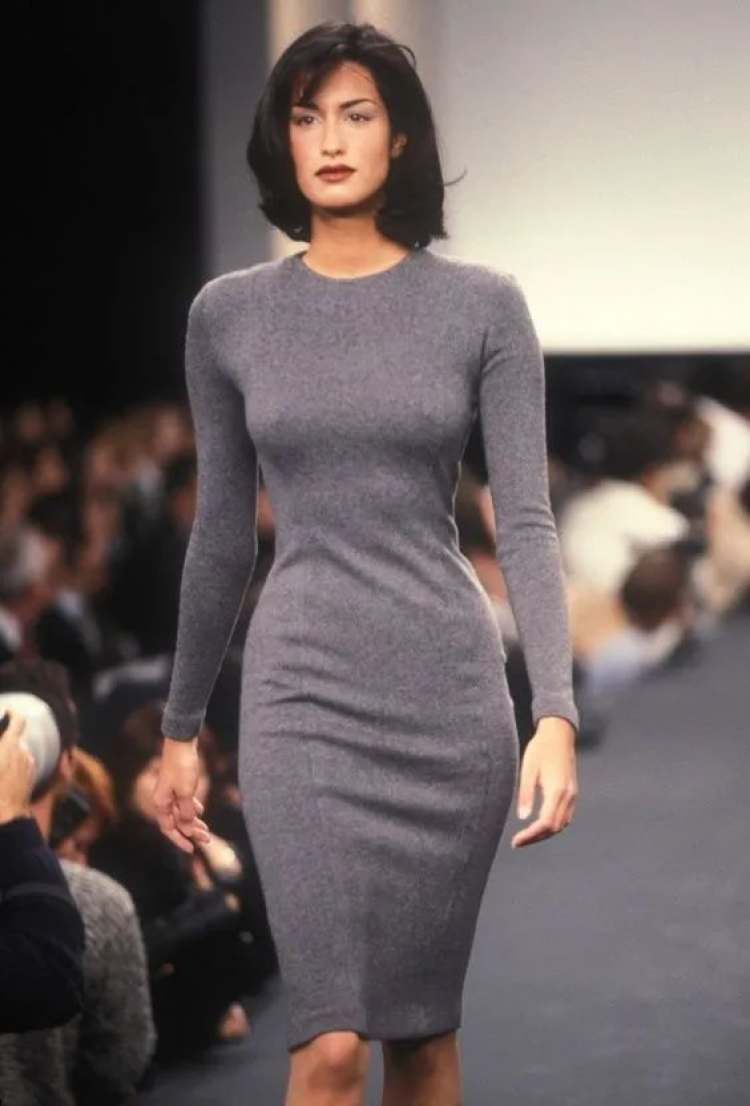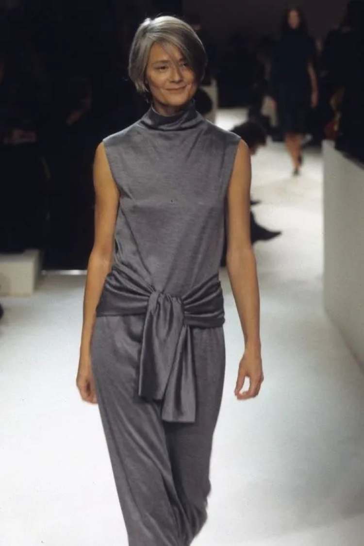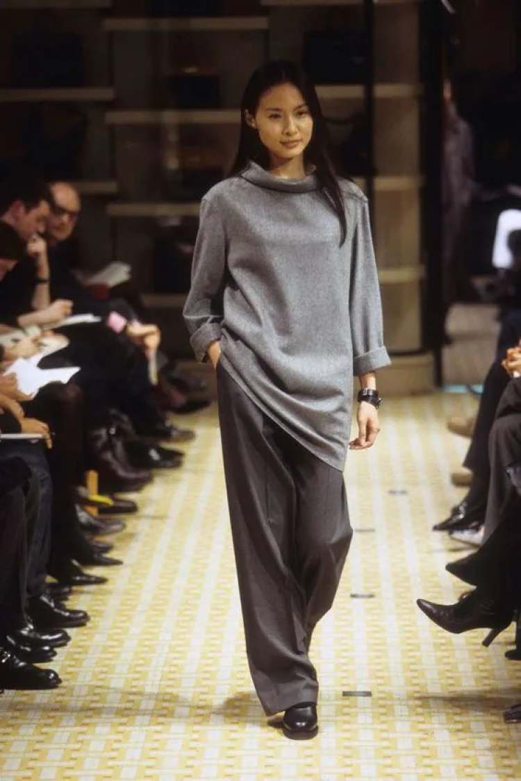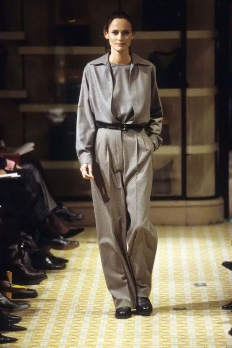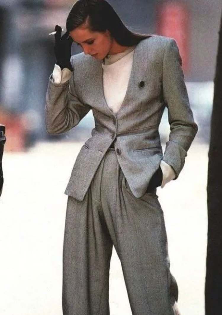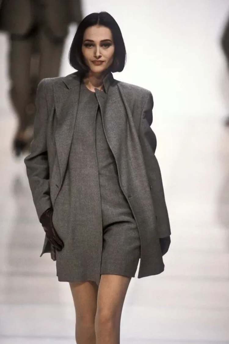 Giorgio Armani在上世纪的runway,也非常爱用灰,且用得很精彩。灰色的廓形吸烟装,灰色的西装外套,灰色的办公裙,Armani身体力行地告诉所有人,性感和露肤度没有任何关系,性感是风平浪静下的暗流涌动,是铁灰色布料内侧的温热。