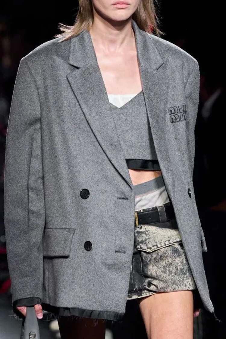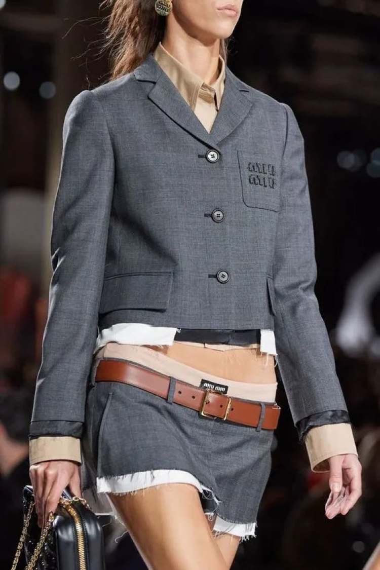 之前有看到一句话说,少女是什么?少女从来都不是温顺的、讨好的,少女感是只身抵抗世界,是逆反规则,是一身反骨。这其实也是Miu式的少女感,要穿性别中性的灰色,也要穿看似庄重、剪裁得当的西服,但是少女的心思都藏在了做旧牛仔迷你裙里。
