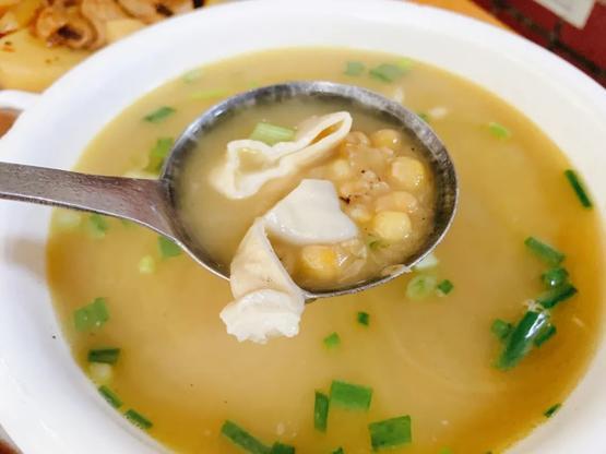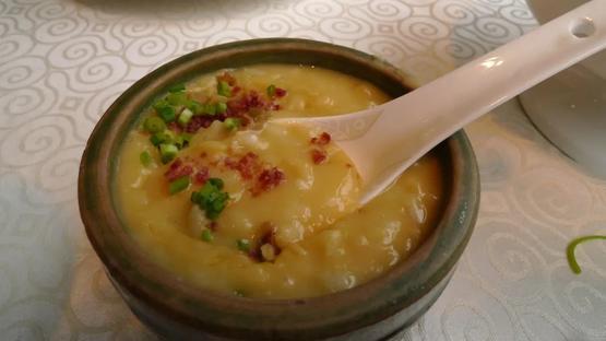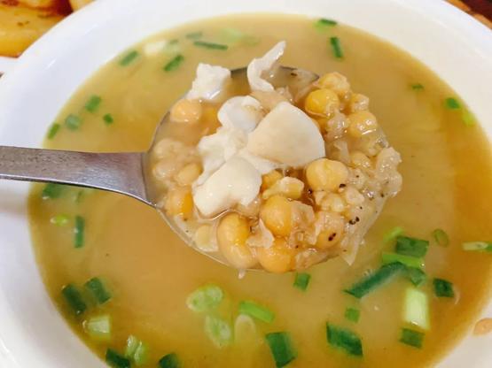 如果家里本身有吃剩的豆汤,加点米饭进去就行。当然,如果能烫上一把豌豆尖会更美味,有汤有主食,冬天一碗下肚,浑身都暖乎乎的。从头开始制作也不难,猪油炒香耙豌豆,加高汤和想吃的肉下去煮,熬到浓郁后盛出加米饭,再撒上几颗翠绿的葱花,香气扑鼻。
