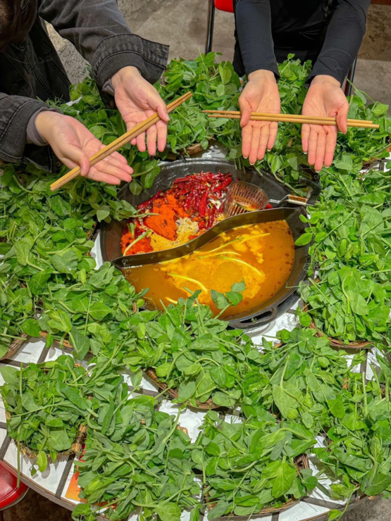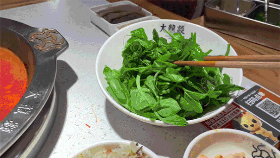 当然,吃火锅也离不开豌豆尖,清红汤任选,不用七上八下,丢下去搅一搅就能捞起来开吃。可能也只有豌豆尖,才能让四川人心甘情愿地点鸳鸯锅了。