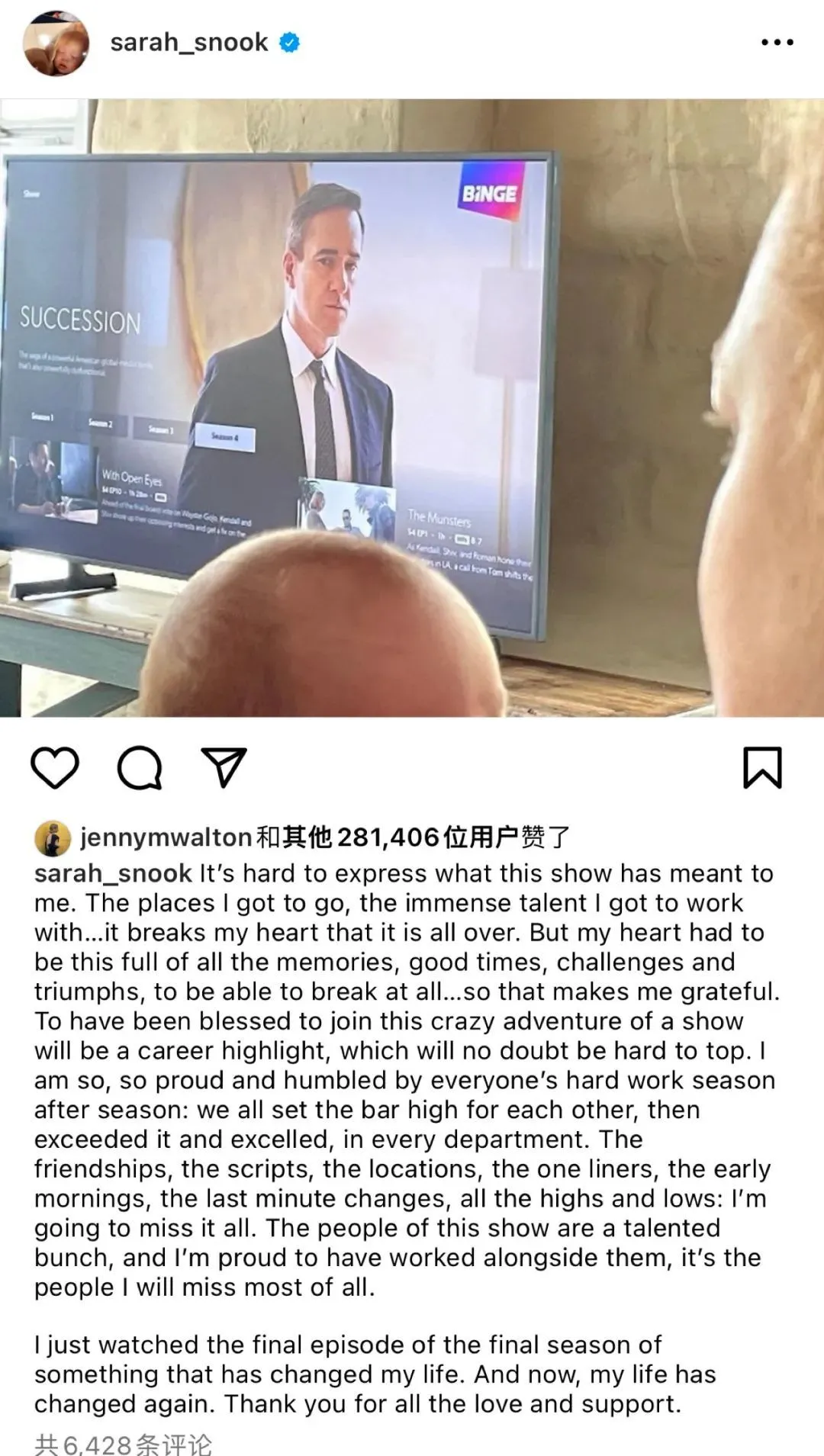 Snook本人在看完《继承之战》的最后一集后,在Ins上写下了长长的告别信,“很难表达这部剧集对我的意义,”她更称能参与出演是“职业生涯的亮点,这无疑是难以超越的”。