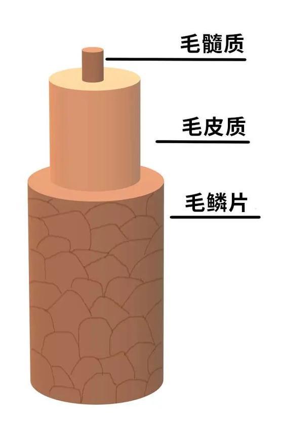 我们的毛发分为发干和毛囊两部分。发干部分切开来看都是一样的。由内而外分别是毛髓质、毛皮质和最外层的毛鳞片。
