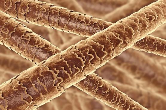 毛髓质中存在着大量的气孔,用于固定空气,轻便又保暖。众多角蛋白连接在一起,包裹在毛髓质外,就形成了毛皮质,它是决定头发粗细、颜色的重要角色。头发主要是由角蛋白组成的(占80%以上),这是一类有着大量二硫键的蛋白。最外层的毛鳞片则是起到保护的作用,上面有着无数的鳞片状的结构。[1]