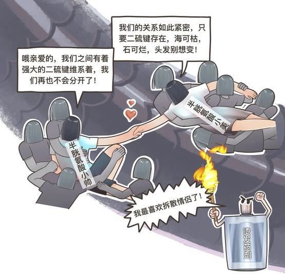 高中生物书告诉我们,肽链由氨基酸通过脱水缩合构成。而肽链成长为一个有稳定三维空间结构的蛋白,还需要二硫键、氢键等的帮助。而二硫键,就是我们头发变弯或者变直的关键。无论使用什么药剂,本质都是二硫键的重新排布。