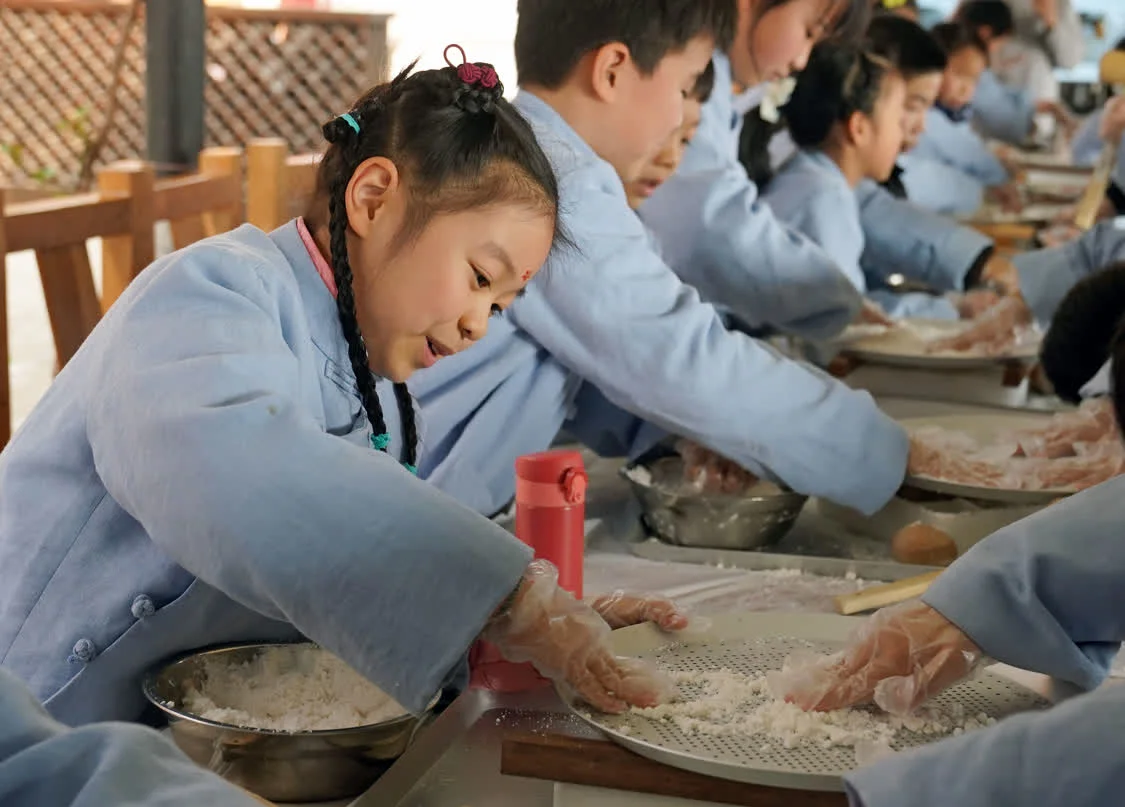 练塘镇“浦江学堂”国学公益班的孩子们在体验焋糕制作(1月13日摄)。新华社记者 刘颖 摄