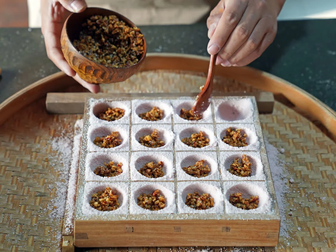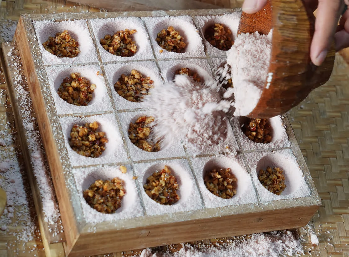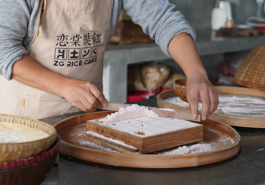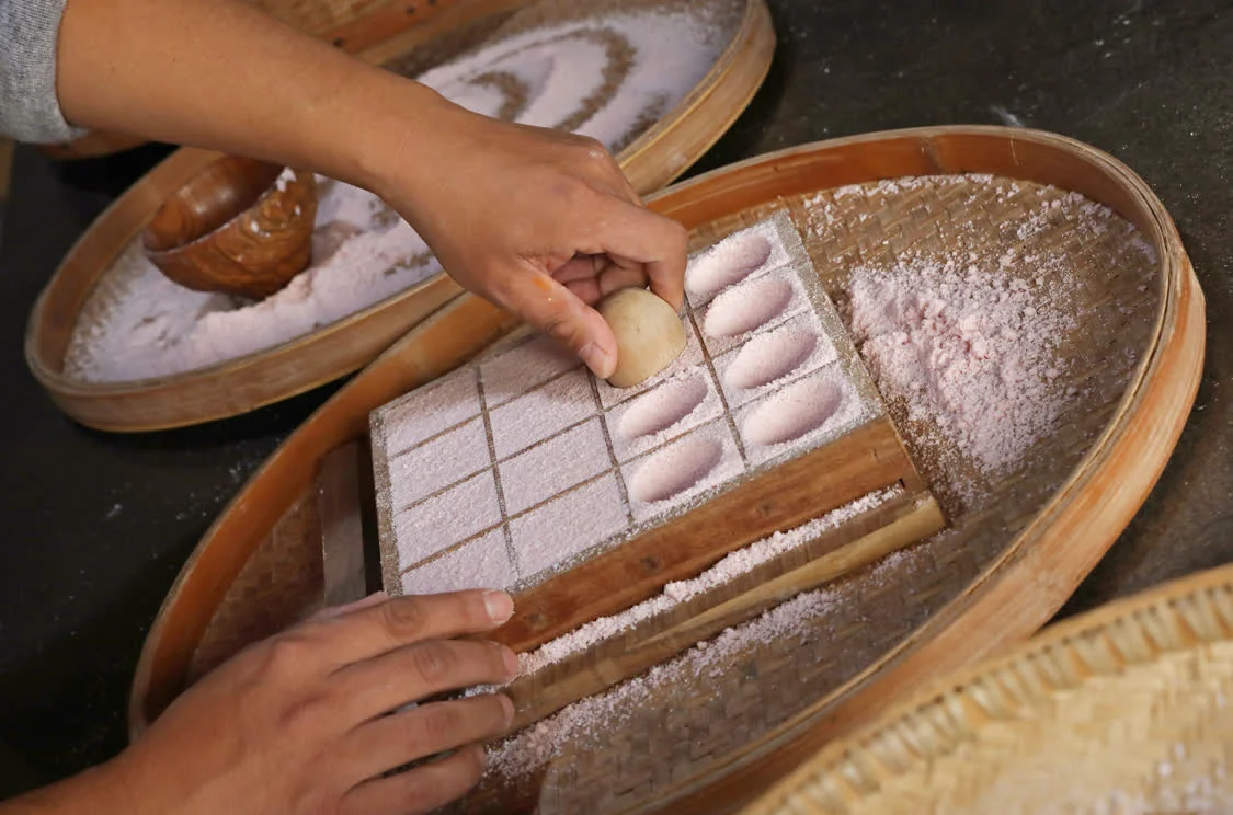 杨勤峰向模具中填入糕粉,封住馅料(1月10日摄)。新华社记者 刘颖 摄
