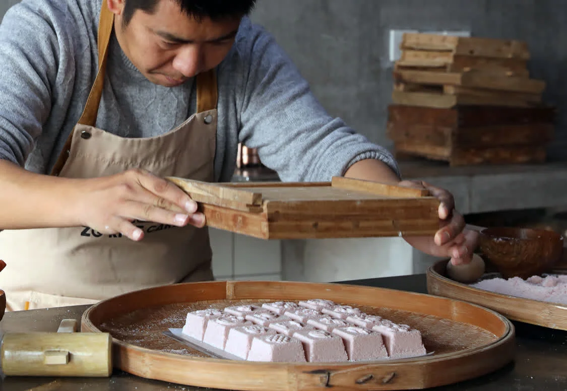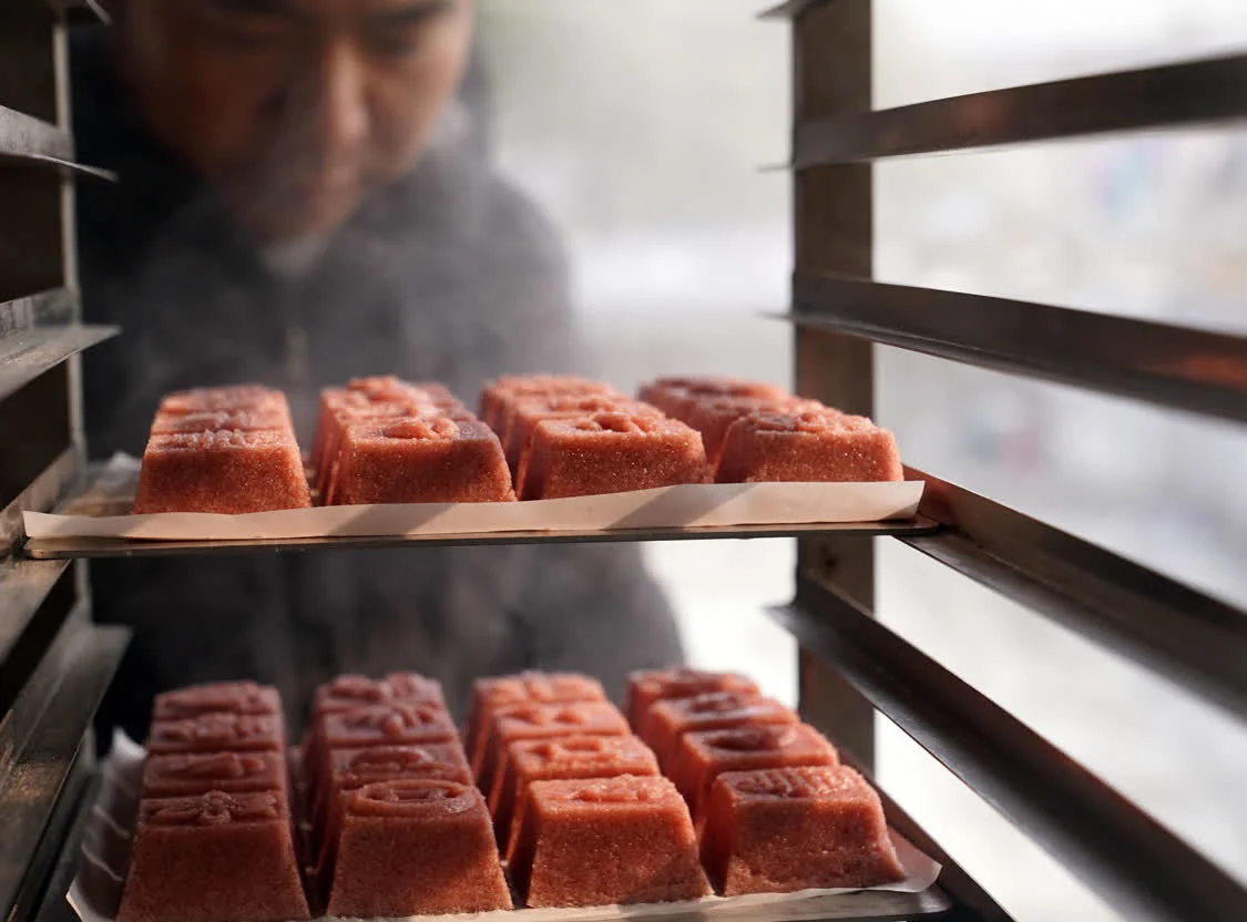 练塘糕团是上海市青浦区非物质文化遗产。焋糕是练塘糕团的最典型代表。焋糕由糯米粉和粳米粉按一定比例混合蒸煮而成,一般要经过磨粉、溲粉、制馅、装模、焋打、熏蒸等工序。 在青浦人眼中,小小一块焋糕是浓浓的年味,也是满满的乡情。 今年43岁的杨勤峰是练塘糕团制作技艺第四代传承人。他的曾祖父当年靠卖糕养家糊口,制糕的手艺也在家中传承。杨勤峰成年后,在上海市区从事建筑设计工作,虽然发展得不错,但他总怀念乡间纯朴自由的生活,终于在2012年返乡创业。 在练塘出生、长大、离开又回归的杨勤峰,对这片土地的感情日益深厚。他创立了自己的传统焋糕品牌,成立了传承工作室,经常举办焋糕的制作体验活动,让这传统美食回归人们的餐桌和记忆。 杨勤峰制作焋糕时,先将糕粉过筛,使其更加蓬松;再将糕粉装满模具,以木制鸡蛋形工具压下开窝,放入馅料;再铺上一层糕粉,用刮尺刮去余粉,使其分布均匀;附上糕布、盖上蒸糕笼,将合拢的模器小心倒置过来焋打。 杨勤峰至今沿用曾祖父留下的焋打法:焋打十六下,刚好落下十六块方糕。最后,将焋打好的糕从合拢的模器中取出,放入蒸锅。蒸制约15分钟,清香软糯的焋糕就做好了。另外,在糕粉中可用彩色粉制成各种颜色的糕点,也可将糕粉揉压成不同的形状,增添糕点的美感。 临近新春,杨勤峰制作的“新年快乐”焋糕又开始供不应求。在他看来,人们对传统美食的传承和眷恋,正因为深藏其中的人间烟火和亲情温馨。 “过年嘛,就是要吃糕。步步高,年年高!”杨勤峰说。