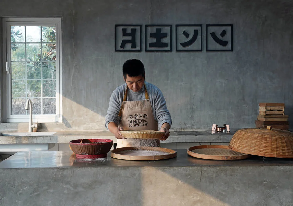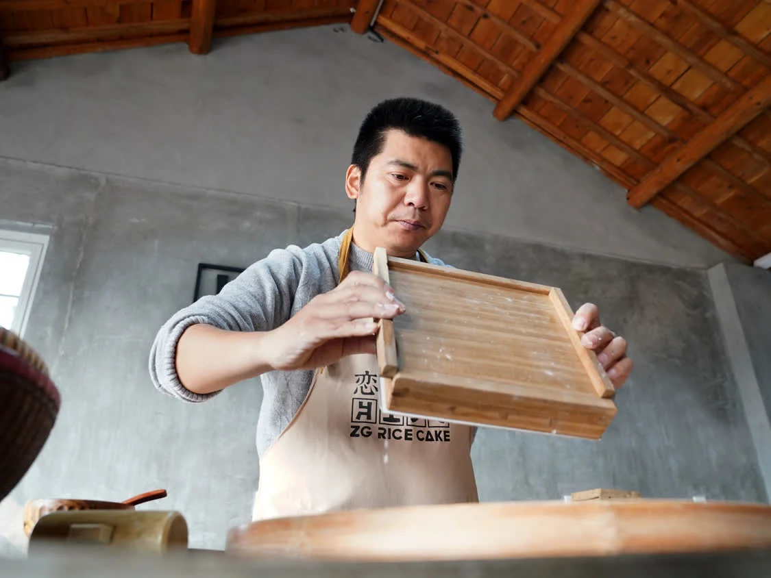 杨勤峰在位于青浦区练塘镇米乐农场内的工作室内制作焋糕(1月10日摄)。新华社记者 刘颖 摄