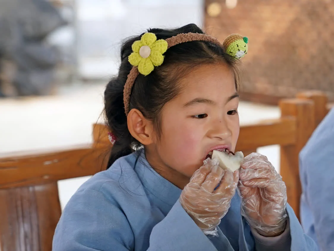 练塘镇“浦江学堂”国学公益班的孩子们品尝自己参与制作的焋糕(1月13日摄)。新华社记者 刘颖 摄