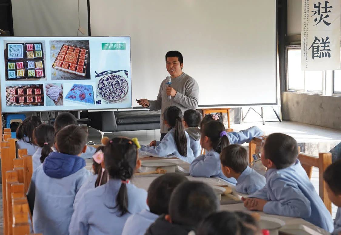 杨勤峰在教授练塘镇“浦江学堂”国学公益班的孩子们了解和体验焋糕制作(1月13日摄)。新华社记者 刘颖 摄