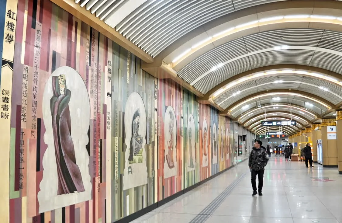 乘客在磁器口地铁站内观看“红楼梦”壁画(1月20日摄)。新华社记者 李欣 摄