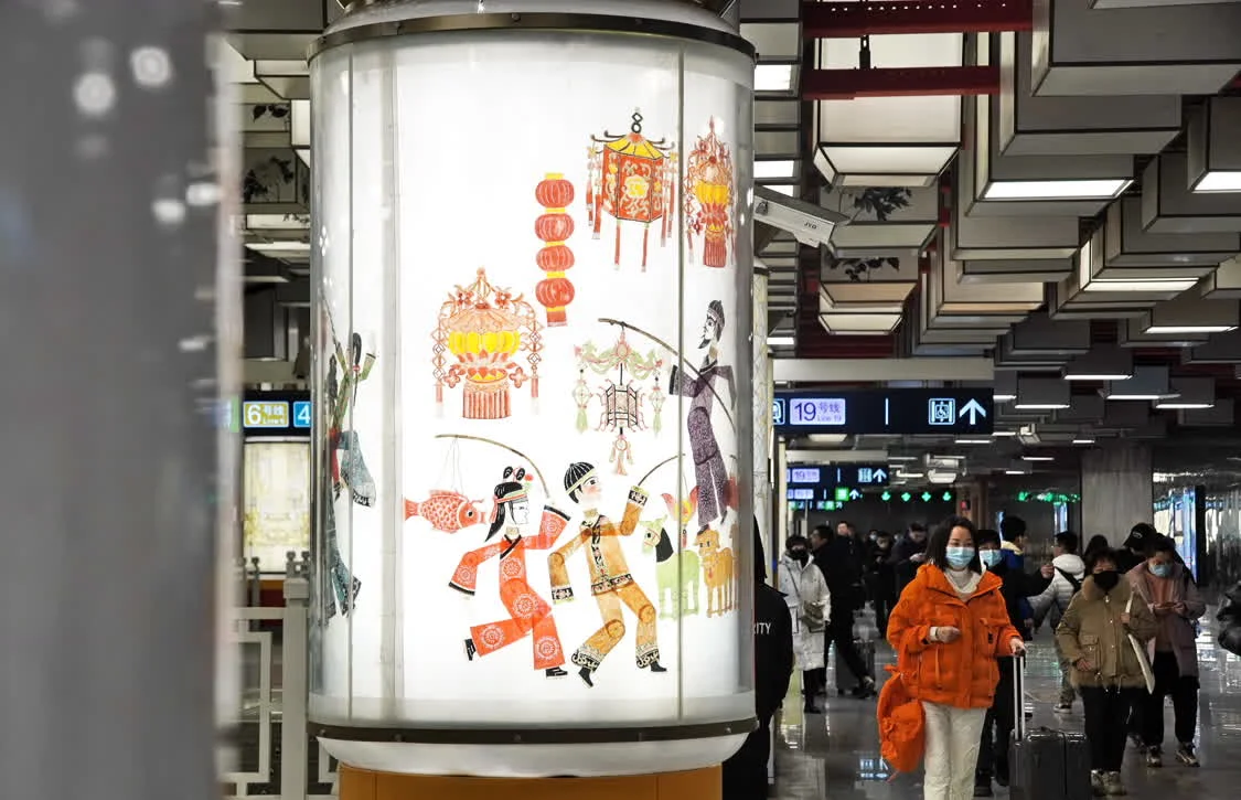 这是平安里地铁站内的中国传统皮影戏走马灯灯柱(1月20日摄)。新华社记者 李欣 摄