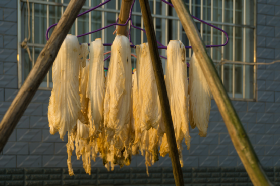 白菜、萝卜因为收获时间相对较晚,晒得也比较晚。晒白菜专门挑选比较小、不适合做酸菜的,将白菜用开水烫过后,挂在阴凉的地方等它风干,同样晒法的还有萝卜缨。萝卜一般切条或者切块,拌上盐后晒干。