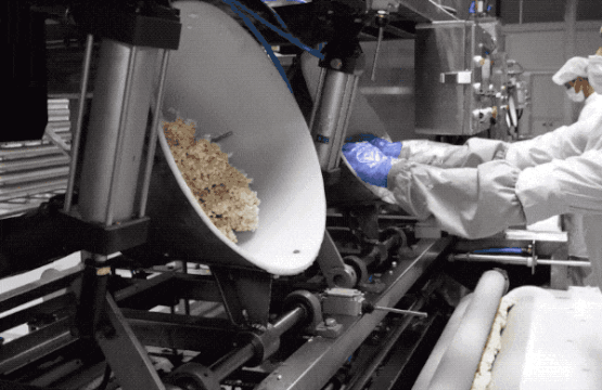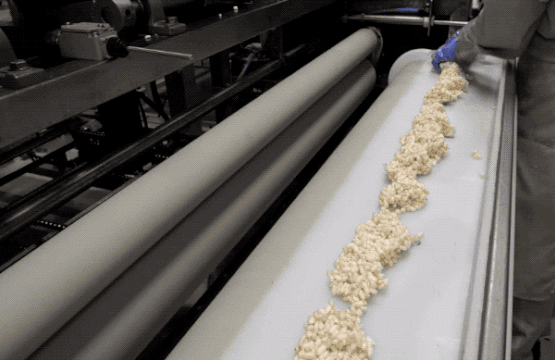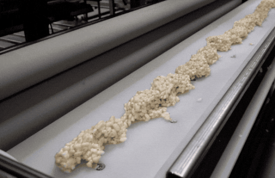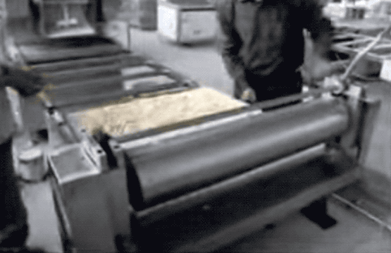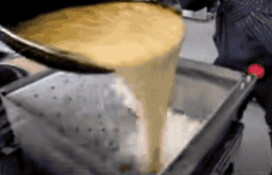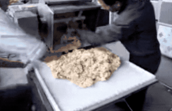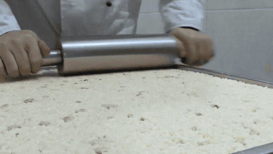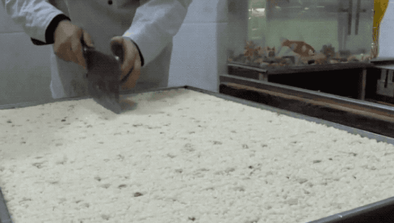 压好的超大块被送去机器切条和切块(此处用了切沙琪玛的视频,但过程是一样的)。