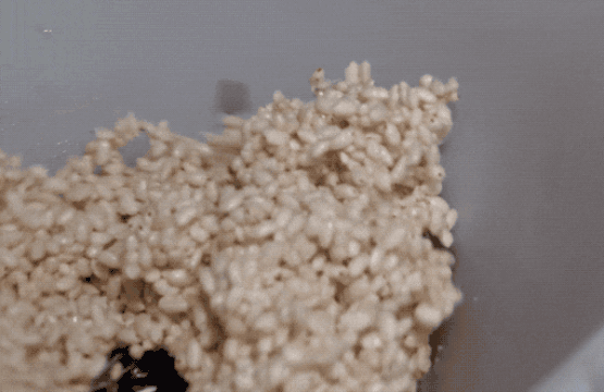 接着混入糖浆、猪油,有时还加入花生和芝麻等果仁,低温小火下烘炒。我老家管米花糖叫炒米,可能就是根据这个步骤命名的~
