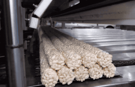 这就是滚好的圆柱米花糖,非常圆。几条合在一起,送去切割~
