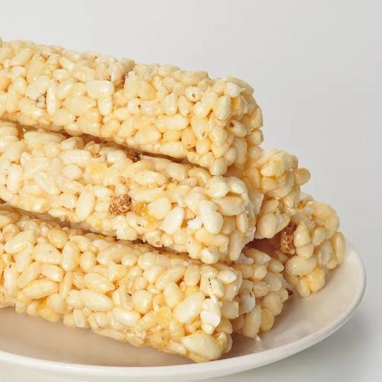 上面的米花糖都是方形的,但我们也有都见过圆柱形的米花糖吧?也叫米花棒或米棒。看边缘的米粒都没有被切开过的痕迹,属于是做起来就是圆柱的。