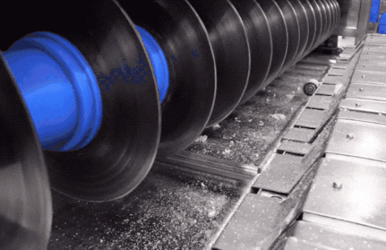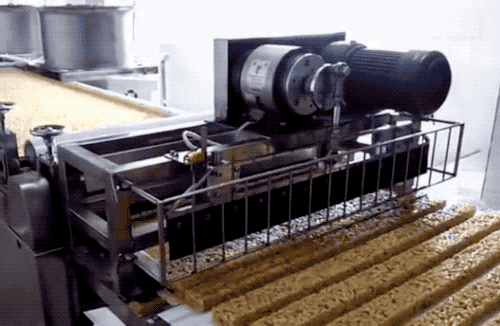 把米花糖推进切割机构,圆锯就把它们切成小段。调整圆锯的间隙能切出不同长度。
