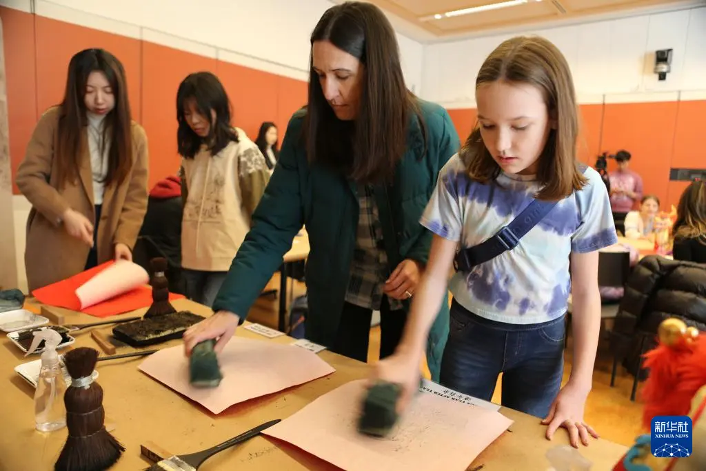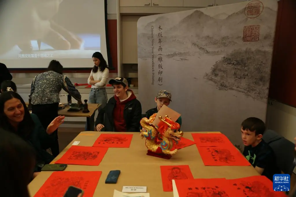 2月3日,在美国纽约大都会艺术博物馆,参观者参加木版年画工作坊活动。