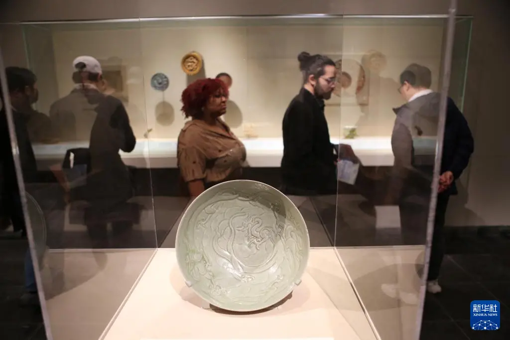 2月3日,在美国纽约大都会艺术博物馆,参观者走过“龙年吉祥”特展上展出的越窑青瓷龙纹碗。