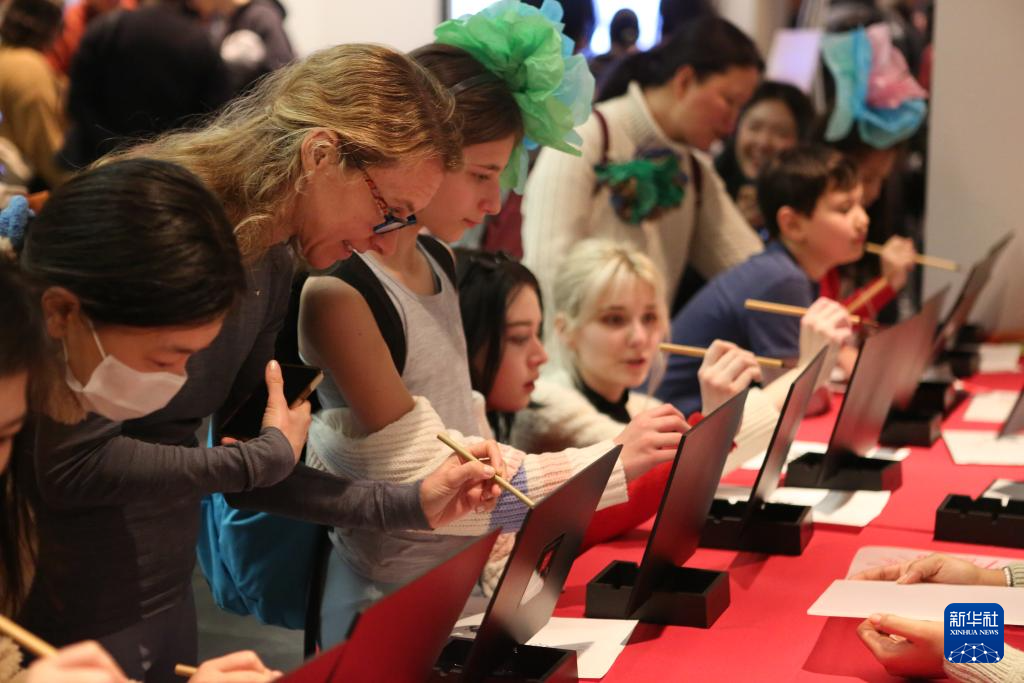 2月3日,在美国纽约大都会艺术博物馆,参观者学习使用毛笔。