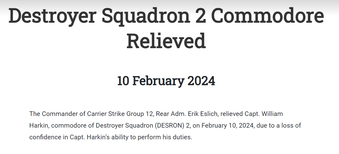 美国海军上周六(2月10日)发布了一份声明,声明表示,第12航母打击大队指挥官埃里克·埃斯里奇少将于2024年2月10日解除了第2驱逐舰中队指挥官威廉·麦考马克·哈金上校的职务,原因是对哈金上校履行职责的能力“失去信心”。詹姆斯·冯·圣保罗上校将接替哈金指挥第2驱逐舰中队,至于哈金则将临时调任至美国海军大西洋水面舰队指挥官办公室。声明称,此次调动不会对指挥部的任务产生影响。