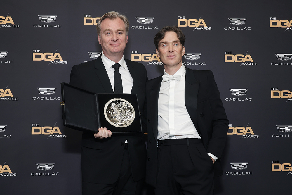当地时间2024年2月10日,美国加利福尼亚,导演克里斯托弗·诺兰凭《奥本海默》获得美国导演工会长片奖,与演员希里安·墨菲合影。视觉中国 图