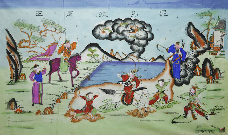 中国艺术研究院收藏的一幅天津杨柳青年画《泥马渡康王》,描绘了宋高宗赵构遭金兀术追击,及至江边,无有去路,危急之时得神人佑护,骑泥马渡江逃生,从而开创江南半壁江山的故事。图绘康王赵构骑马在江上奔驰,如履平地,前后有童子、侍卫护驾,康王头顶上方黑色云朵中幻化出腾龙一条,是对赵构未来天子身份的暗示。