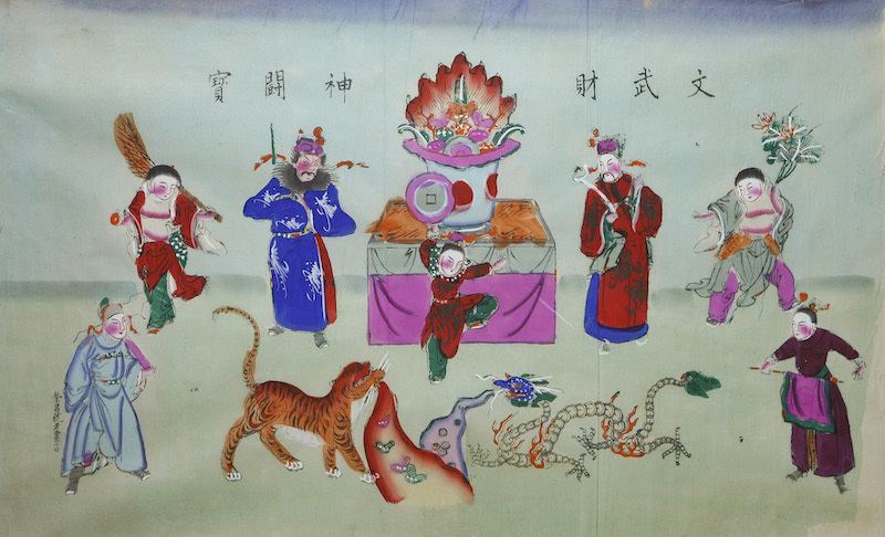 另有一幅《文武财神斗宝》,构图分为前景和后景两层,后景中为文武财神与和合仙人,中间桌上放置巨型聚宝盆,桌前一红衣戴冠童子单臂举一大钱。前景中央,一花斑猛虎与一四爪钱龙口吐元宝金钱,作争斗状,虎、龙身后各有一仙人,似在临场指挥。整件作品以龙虎斗宝指代文武财神之斗宝,其意不在争斗,而在财宝之多也。
