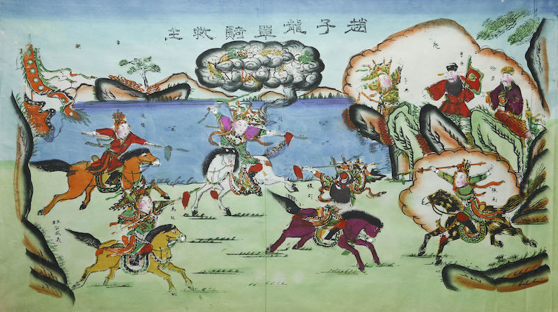 天津杨柳青年画代表作《赵子龙单骑救主》描绘刘备兵败于曹操,率民投江夏,曹操大军追至长坂坡,刘备眷属均于乱军中失散。赵云单枪匹马闯入重围,奋勇救出简雍、糜竺、甘夫人等,又受糜夫人之托怀抱阿斗,夺得曹操宝剑,力战突围脱险,终将阿斗交与刘备的故事。图绘曹将围战怀揣阿斗之赵云,阿斗上方一缕祥云升起,云中腾龙隐现,暗示了阿斗即未来的真龙天子。