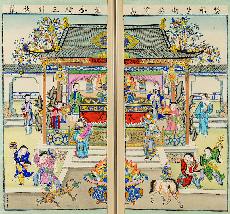 俗语云“宝马驮来千倍利,钱龙引进四方财”,杨柳青年画亦有同名主题的年画,以门画和贡尖形式为代表。贡尖中的仅描绘了“钱龙引进”的画面,画中的一头戴太子冠的童子身骑青色钱龙,手托宝物从天而降,钱龙口中倾泻而下各种财宝,二位财神率众童子也与下方为人们送来财富。另一对为民国时期以祈财为主题的吉祥门画,画面属于典型的仕女娃娃类。画中女子皆为民国装束,其中“钱龙引进四方财”一幅中的女子怀抱一大钱,上面有“宣统元宝”“北洋造”的字样。女子身旁童子手执互相交叉的两个大钱,头顶的祥云中钱龙正翻滚而至。该画用色浓重大胆,人物造型简率。与此画主题相似,杨柳青还有一种对屏年画,民间谓之“对楼”,画上题有“发福生财招宝马,堆金积玉引钱龙”字样。画面中央绘一聚宝厅,厅内的桌上摆有硕大聚宝盆,户主夫妻端坐于聚宝盆两侧,厅后长出摇钱树。前景中央,亦有一聚宝盆,左右有钱龙游走、宝马驮财,刘海、和合、招财童子、利市仙官也送来财宝。整幅作品对于器物花饰的刻画不厌其详,再加丰富的色彩,给人以精美、缛丽之感。