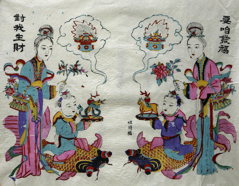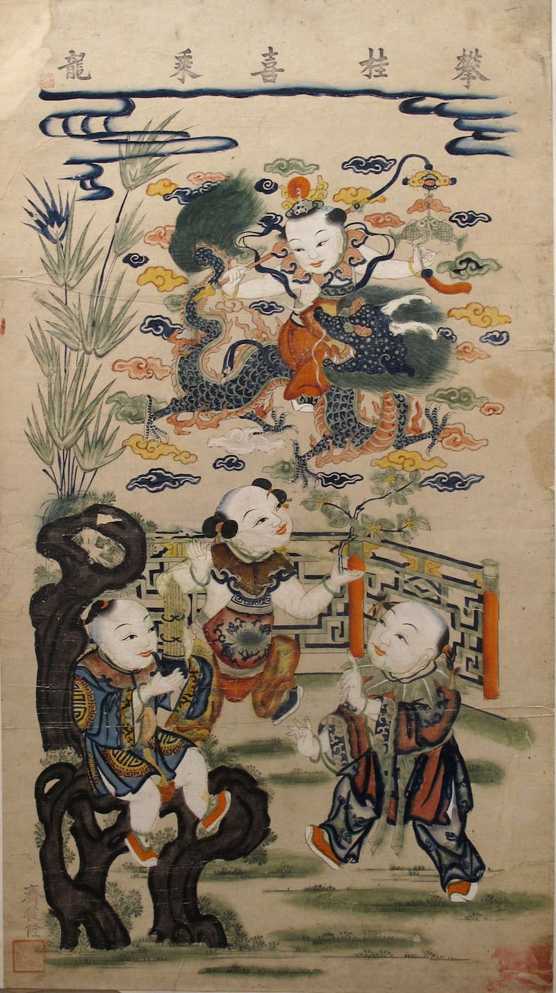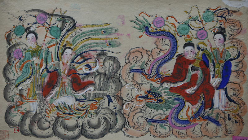 “龙凤呈祥”一直是各民间美术品类热衷于描绘的题材,年画中的这一主题多与神话传说人物弄玉和萧史有关。相传春秋时秦穆公女儿弄玉,嫁与善吹箫的萧史为妻,后来二人乘龙跨凤而去。汉·刘向《列仙传•萧史》亦有类似记载,称“萧史者,秦穆公时人也,善吹箫,能致孔雀白鹤于庭。穆公有女字弄玉,好之,公遂以女妻焉,日教弄玉作凤鸣。居数年,吹似凤声,凤凰来止其屋。公为作凤台,夫妇止其上不下数年。一旦,皆随凤凰飞去。故秦人为作凤女祠于雍宫中,时有箫声而已。”民间对此传说有诸多描述,并演变出“乘龙快婿”的成语,并借此“龙凤呈祥”之意表达对美满婚姻的期盼,并祝颂人们百年好合,生子显贵。