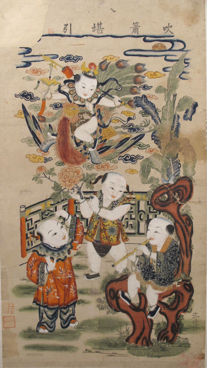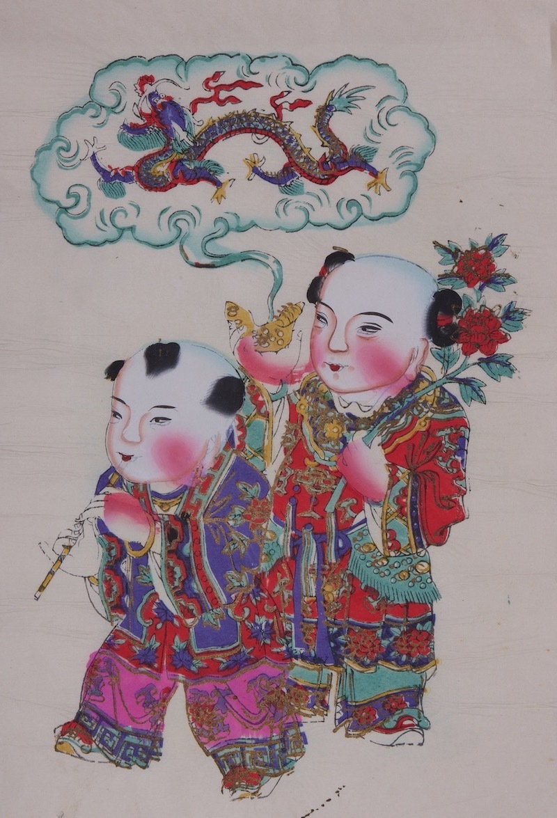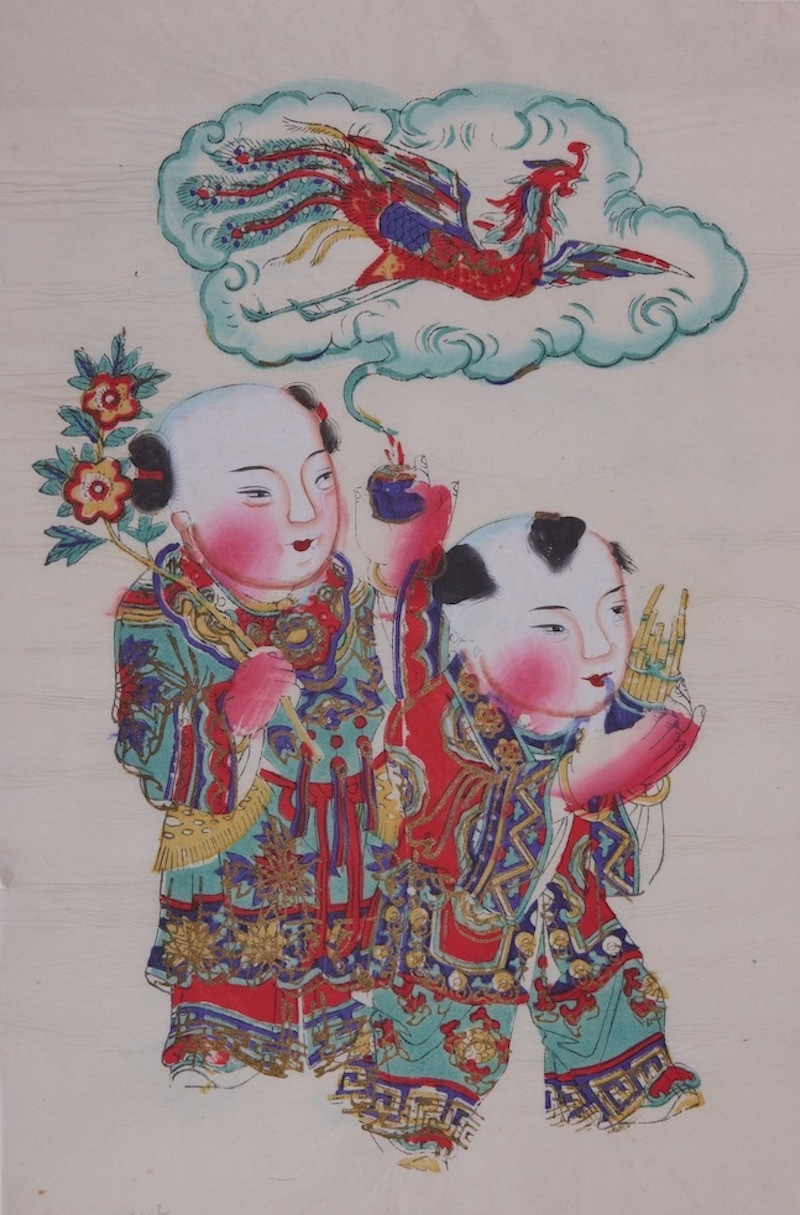 除了上述之体裁,在杨柳青的吉祥门画中,也有多幅“龙凤呈祥”作品,图中人物全部为华服童子,其中一对门画中的童子或吹箫或吹笙,手执牡丹、梅花、元宝、宝珠等物,以画面上方幻化出的腾龙和彩凤点题。另一对门画中的童子骑龙跨凤,手执如意,肩扛小锄,手中托举的宝物中写有龙、凤二字。此类作品无不色彩艳丽、绘制精细,让人观之顿觉富贵华美、喜气盈盈。