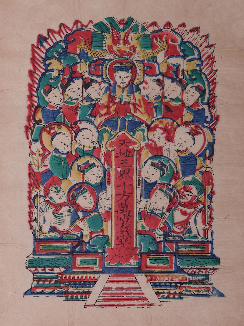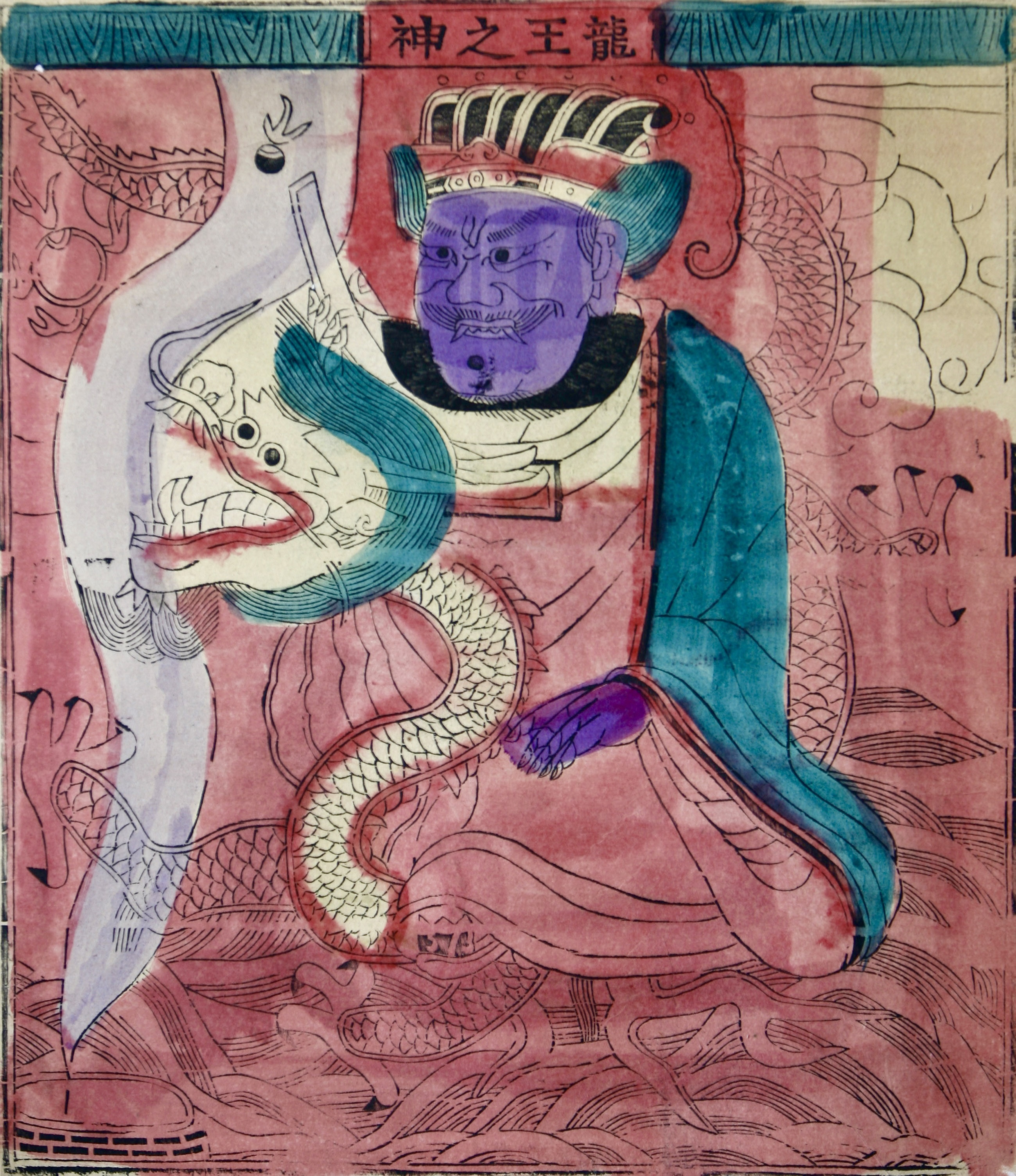 在全国各地所印行的纸马年画中,龙王是较为流行和常见的题材内容。龙王为民间传说中统领水族之王,掌管兴云降雨,属四灵之一,民间认为敬龙王能消灾降福,免受水患及干旱之苦,象征风调雨顺。汉代时已有祈雨时祭土龙之习俗,唐宋时皇帝封龙神为王,专司水旱。宋·赵彦卫《云麓漫钞》曰:“古祭水神曰河伯。自释氏书入,中土有龙王之说,而河伯无闻矣。”《太上洞渊神咒经》中载有“龙王品”,将龙王分为以方位区分的“五帝龙王”,以海洋区分的“四海龙王”,以天地万物为区分的五十四位龙王和六十二位龙王。另外,民间亦认为龙王有招财之能力,如典故“沈万三打鱼”中,富翁沈万三的聚宝盆乃龙王所赐。