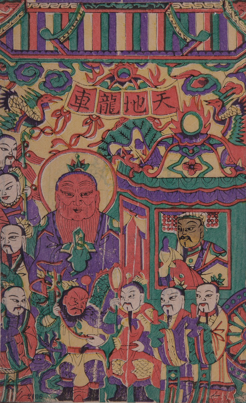最后,年画中的龙远不止以上几种,其形式、状貌、纹样、功能之多,不胜枚举,此处只概略列举几处。以龙纹装饰为例,普遍流行于各地的纸马《天地全神》画面两侧边缘多竖立两桩盘龙旗杆,旗杆顶端也有龙头装饰,凸显出众神的磅礴气势,《灶王》纸马上也常用“双龙戏珠”图案作以装点。年画中还有用于祈雨的龙旗、神像帷帐上的龙、人物身着的龙袍等均有龙纹的出现,其形可分团龙、坐龙、行龙、云龙等。