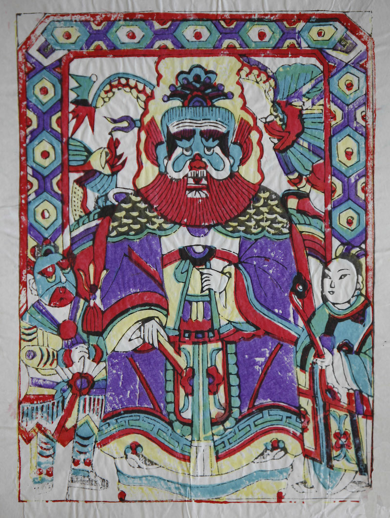 陕西凤翔年画中有几种不同的龙王形式,当地普遍敬奉“家宅六神”之一的龙王,民间还有“福水养百口、一泉共万家”的民谚,不仅为了保佑家人有水吃,也希望能有足够的水来灌溉庄稼。其画面中的龙王头戴高冠,龙睛圆睁,耳有毫毛,满髯下垂,身穿衮服,肩部饰有龙鳞纹。上方左右有小龙缠绕,下部为一文一武二官。整幅画面构图饱满,色彩艳丽,对比强烈。