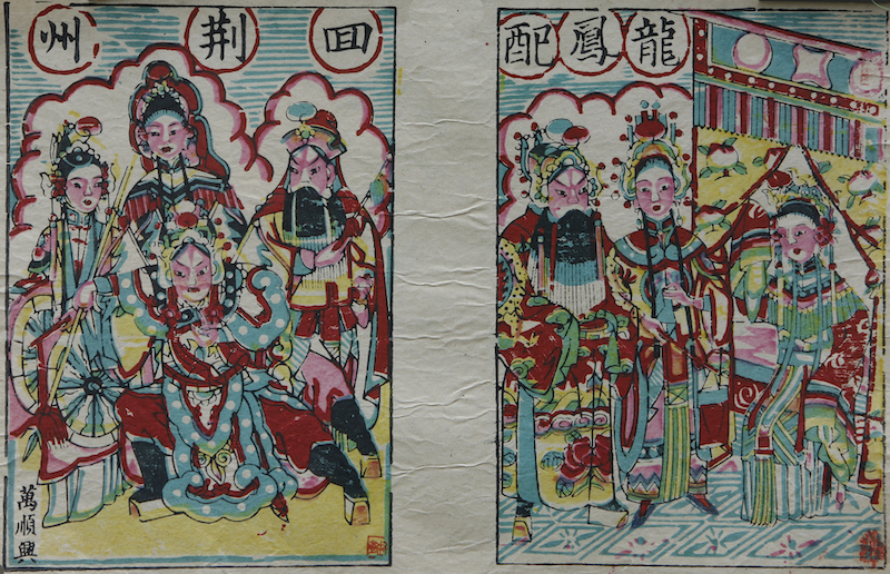 以龙凤为主题的年画中,取材自《三国演义》中刘备与孙尚香婚配的《龙凤配》也占比不少。《龙凤配》又称《东吴招亲》,是《三国演义》第五十四回故事,故事讲述孙权屡次向刘备索还荆州未得,乃用周瑜之计,假称以妹孙尚香许婚刘备,诓其过江,索还荆州。诸葛亮识破,将计就计,让赵云随备往,临行授以锦囊妙计,嘱其紧急时打开。刘备依锦囊拜会孙、周二人岳父乔玄,令其于吴国太处斡旋;吴约刘备至甘露寺相亲,弄假成真,刘备入赘东吴。天津杨柳青年画有《东吴招亲》一幅,图绘刘备与孙尚香成亲后,宫女提灯送刘备入洞房之情景,洞房帐幔之上,一条通体黄色的四爪龙描绘的栩栩如生。河北武强亦有多幅《龙凤配》年画,常搭配《回荆州》内容,以两个画面完整描绘刘备与孙尚香成亲以及赵云保驾回荆州的情节,画面对龙凤配新婚之喜悦、回荆州赵云之英武无畏,均描绘的相当突出。目前可见,在陕西、河北、天津、江苏、山东等地也都有《龙凤配》年画题材,形式不一。