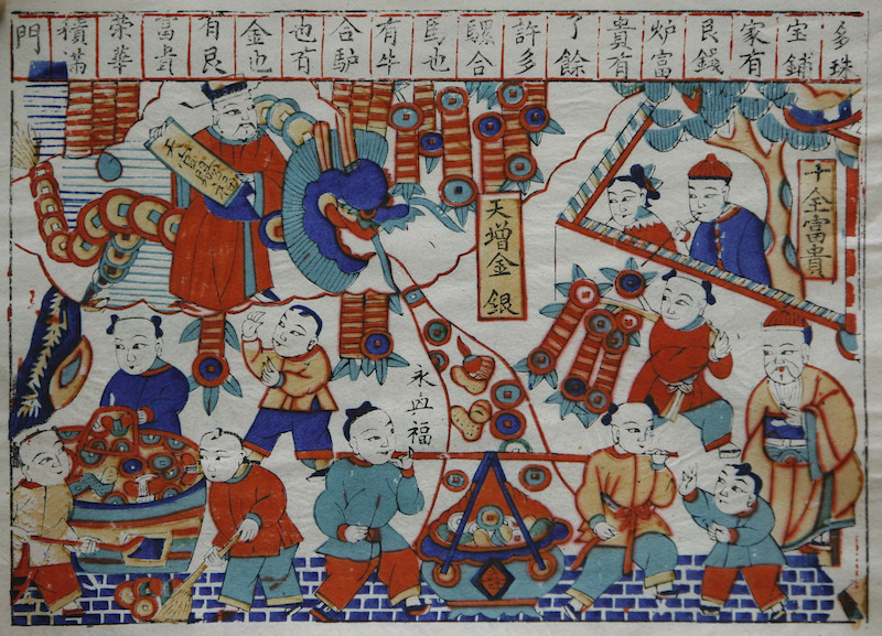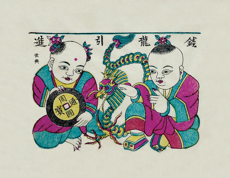 陕西年画《钱龙引进》画面由两名童子手持铜钱表现富足、安康的寓意。二童子中间有一条蜿蜒的钱龙,所绘童子造型颇为富态,符合画决中“短胳膊短腿大脑壳,小鼻子大眼没有脖;鼻子眉眼一块儿凑,千万别把骨头露”的描绘。整幅画面色彩对比强烈,寓意丰富,洋溢着祥和之气。山东潍县横披年画《天官赐福》的左上方,为一硕大钱龙跟随天官,口吐财宝为人间赐福的场面。画面下方有数位童子,或收集财宝,或二人抬宝,或肩扛金钱串,纷纷将财富迎回家中。画面右侧绘制庭院一角,门外站立一位老者,手捋须髯,等待童子送宝进门。院内一对夫妇面带喜色,向外眺望。此画构图别致,设色艳丽,画面上“十全富贵”、“天增(赠)金银”的字样表现了人们祈求富贵双全,财富不断的美好愿望。同样是山东潍县的一对《要咱发福、对我生财》的美人条年画中,两位童子身骑大鲤鱼,双手托盘,盘中各有宝马一匹,钱龙一条,宝马钱龙绘制的虽然不大,但神态生动,亦突出了发福生财的主题。