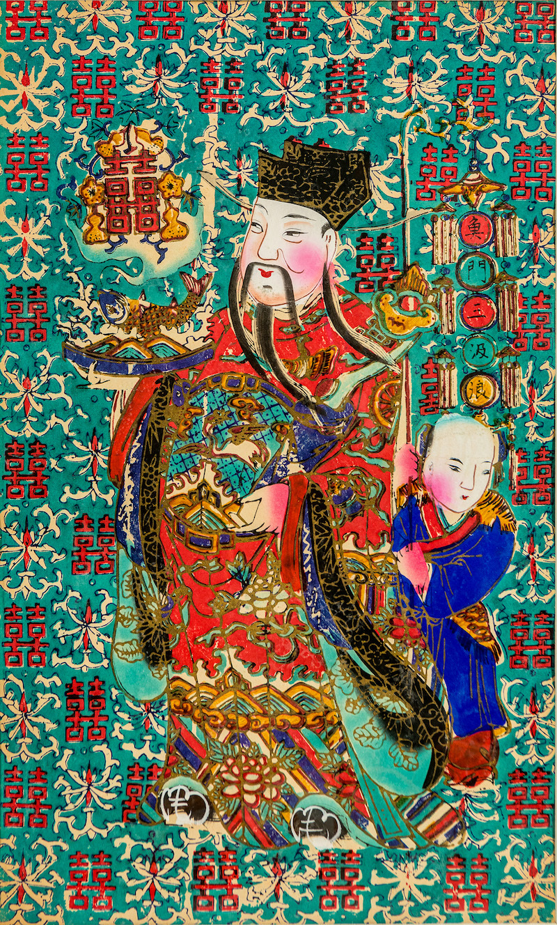 中国艺术研究院藏有一对天津杨柳青的文官门神年画,取名《鱼门三汲浪、平地一声雷》,典出北宋汪洙《神童诗》中的“禹门三级浪,平地一声雷”一句。“鱼门”即指“禹门”,也指“龙门”,《吕氏春秋》中记载为大禹治水时所凿。民间将科举考试中选称为“登龙门”。“三汲浪”指在乡试、会试、殿试三次科考中屡次中选。“平地一声雷”则颇有“十年寒窗无人问,一朝成名天下知”的意思。此对门神寓“及第登科”“飞黄腾达”之吉祥用意,在技艺手法上除六色套印外,加印金色,并饰绿地双喜字纹样,更显富贵华丽。