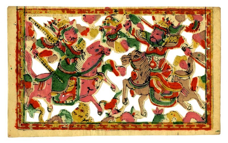 另一类指代“真龙天子”的年画名曰《龙虎斗》或《龙虎会》,其中的真龙天子特指宋太祖赵匡胤。画面讲述宋初之时太祖赵匡胤御驾亲征,被困河东。呼延赞闻信,举兵至河东寻赵报父仇,危急之时,呼延赞见赵匡胤身边有火龙出现,知其为真龙天子,乃归降赵匡胤。因呼延赞有猛虎护身,故此类年画称《龙虎斗》。纸扎画是流行于福建漳州、泉州的特有的年画类型,其中福建泉州的纸扎画《龙虎会》亦描绘此内容,画面左侧大将为呼延赞,其骑红马、扬双鞭,下方绘一猛虎,右侧大将骑于马上,使一长柄武器,应为赵匡胤,其前方闪现一条腾龙,代表了他“真龙天子”的身份。