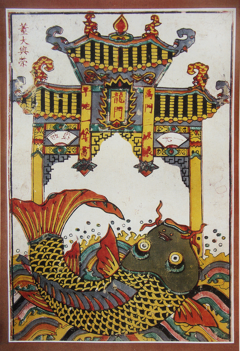 四川夹江董大兴荣字号出品的《鲤鱼跃龙门》年画,以该地常见的章丹、槐黄、佛青等矿植物颜料印制而成,设色古雅。图中远景有龙门矗立水中,近景中一硕大鲤鱼激起朵朵浪花,蓄势欲跃。