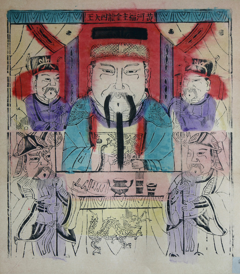 还有一种水神,人称“金龙四大王”,在民间广受人们奉祀。《古今图书集成》“神异典”卷二十七记载“金龙四大王”为南宋末钱塘人谢绪,因其年轻时于金龙山望云亭求学,因见天目山崩,水溢临安而溺死无算,乃散家资救济,南宋亡,谢绪赴水而死。隆庆时,遣兵部侍郎万恭致祭,追封其为“金龙四大王”。北京纸马中的“金龙四大王”冠以黄河福主名号,身着官服,相貌庄严,身侧上下有四随侍陪祀,所用香案之下绘一四爪走龙,点明其龙王身份。此外,民间也认识其为古代船运业的保护神。
