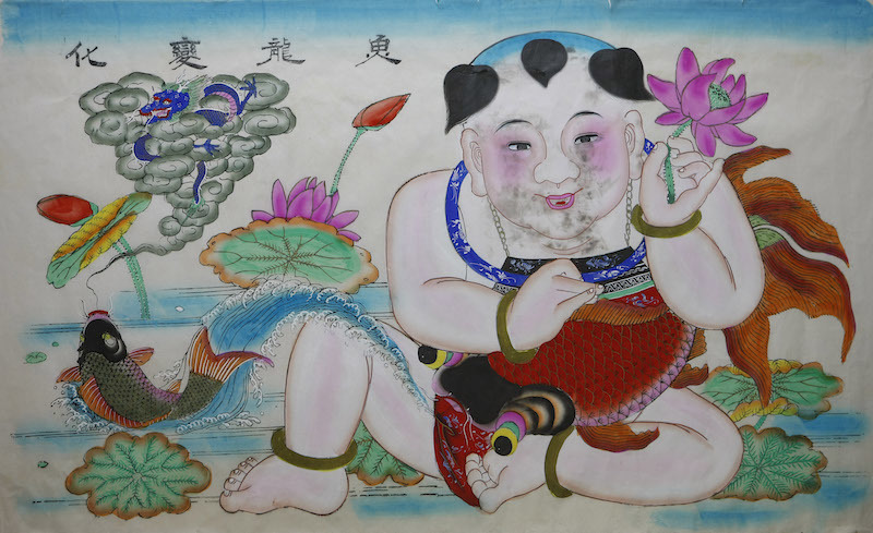 天津杨柳青多有“鱼龙变化”题材的年画传世,形式为杨柳青年画经典的“娃娃抱鱼”,规格有三裁也有贡尖。画面中央常绘一扎髻童子肩扛或怀抱一大鲤鱼,边侧部位多以云雾缭绕中幻化出青龙一条指代“鱼龙变化”之意。此类年画较为特别的是山东潍县的一副《鱼龙变化》,体裁为当地流行的大横批,画上除了鱼龙变化外,还有“海献(市)蜃楼”“福寿三多”“四时如意”等。画师在不大的画幅中绘制了六位人物形象,五个童子在一仕女的带领下作捕鱼嬉戏状,围栏之外的水面中,一红色鲤鱼正欲跃出水面,在其上方,一云龙蜿蜒飞腾,整件作品色彩富丽,寓意高升昌盛,自寒贱而登显贵。