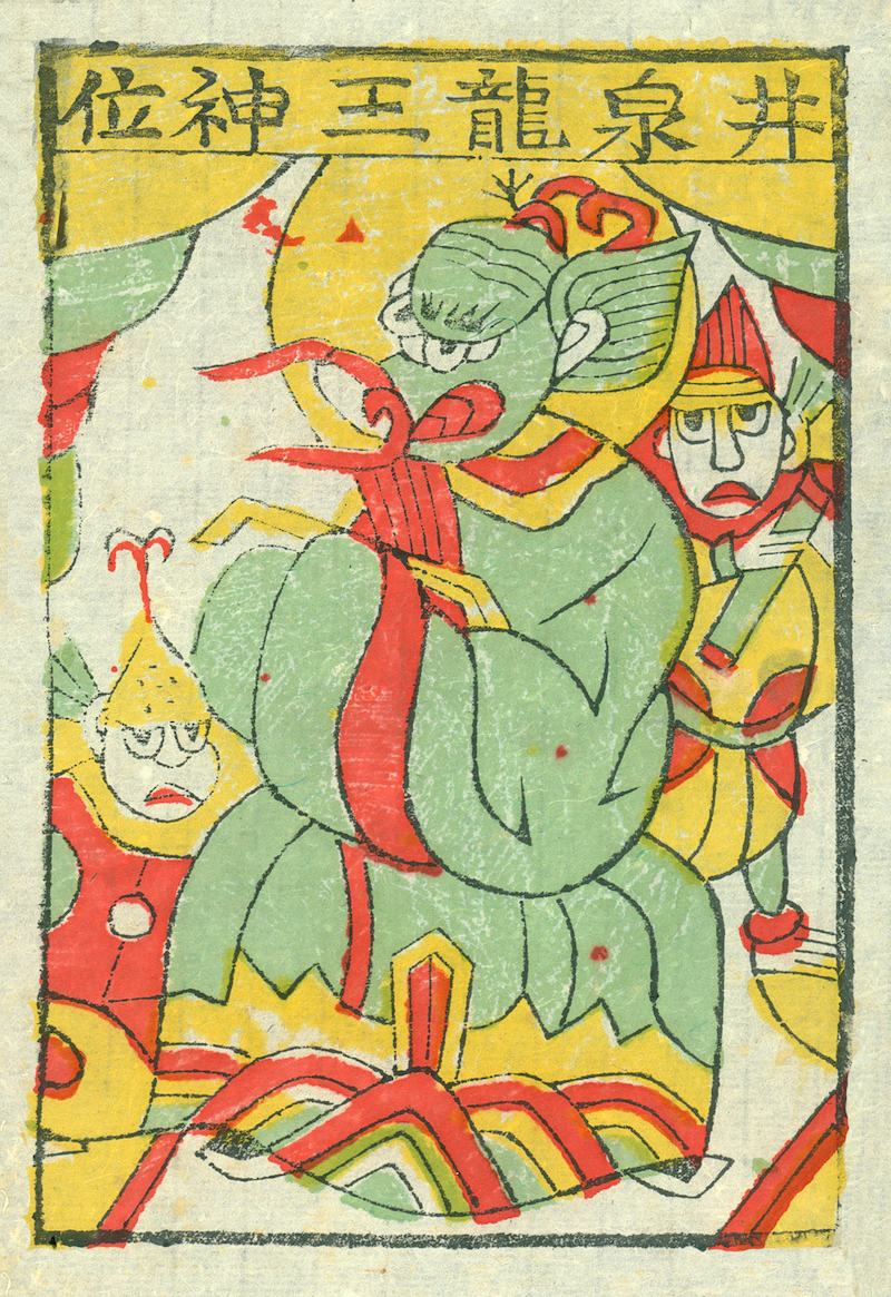 此外,在凤翔以东的蒲城地区,还流行一种“井泉龙王”神码,图上的井泉龙王长相如龙王形貌,穿袍服,龙睛巨口,耳生毫毛。龙王前后各有一侍从,背景刻有幔帐,衬托出龙王乃居于水底深宫的帝王身份。当地祭拜龙王具有实用性和功利性的一面,直接适应民众的精神和物质生活需求,兼具世俗性特征,唐代时凤翔一带民间便流行敬龙王、水神的风俗信仰,也有“祈雨”的种种仪式,祭拜龙王是人们祈求风调雨顺的其中一种手段。加之关中地区井深至二、三丈余,吃水不易,井的数量也十分稀少,一般多户家庭共用一口井,故民间多祭祀井神,求龙王赐以净水,当地人对于水的爱惜程度不亚于对粮食的珍视。