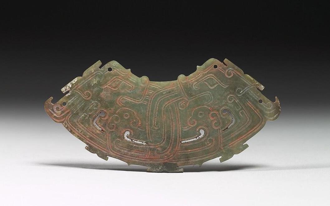 浅青绿玉,局部泛灰黑。双面纹饰相同,以中轴为对称轴,左右两侧为具有头角和蛇身的神龙,中央下缘则为身躯交缠的一对耳鼻分明的神人,龙和人的形象以逗点形的镂空区隔。玉璜是组玉珮的组件,组玉佩是配戴在颈项并向下垂挂至腹部的串饰。本件玉璜两侧共有四个系带穿孔,用以串组上下的玉组件。由目前考古所知,组玉佩中的玉璜数目和墓主人的地位等级有关,数目愈多等级愈高,这种现象在西周晚期时渐成定制。此类较简化的神人和龙,是西周晚期常见的风格特征。本器设计精美,表面残留若干墓葬内棺中常见的朱砂,是研究此时礼仪文化重要的参考品