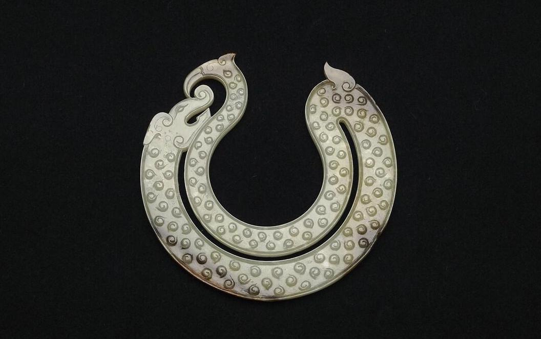 器形似大小二C字相依,起迄相连,线条弯转流畅,造型简单优雅。其实,这是一隻身躯中段迴折、头尾相接的龙与凤,器身饰穀纹。