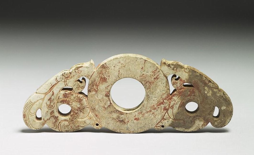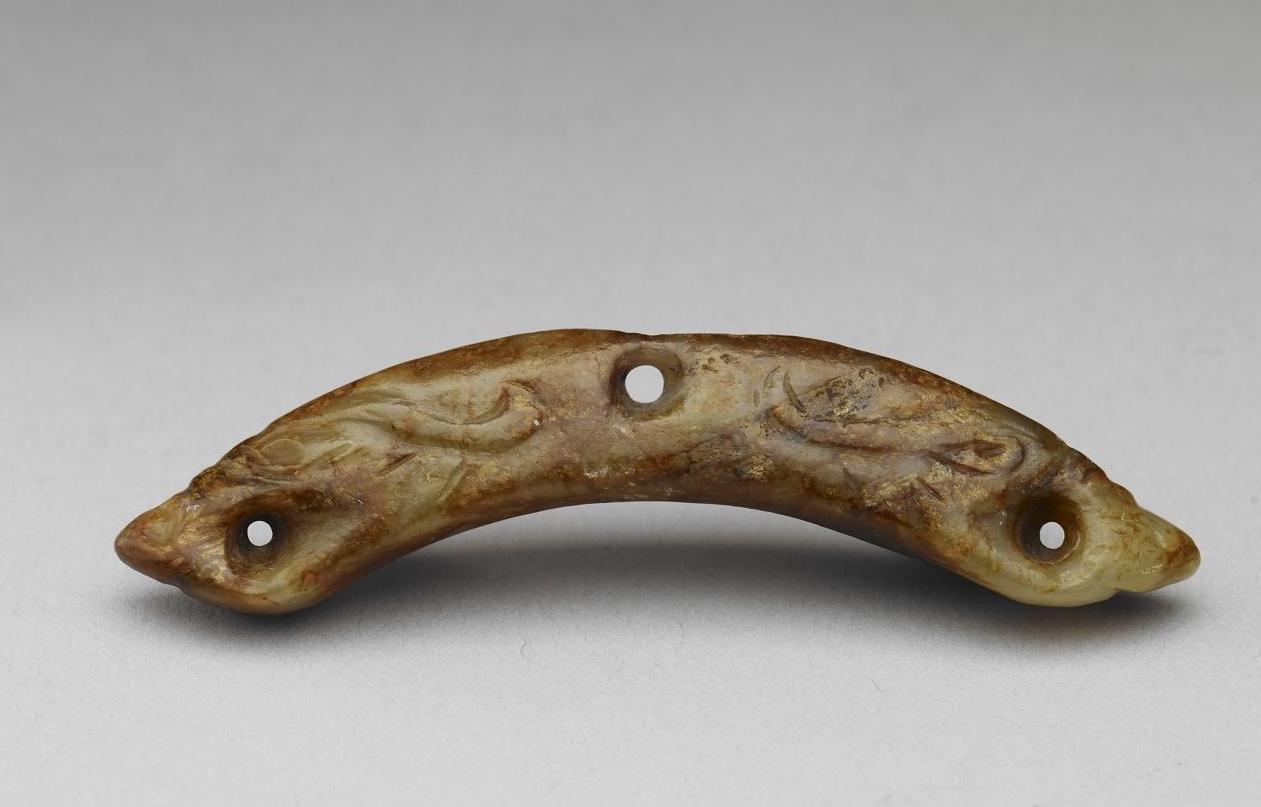 这件双龙首璜中央上端有供系挂的小孔,二端在龙口的位置钻凿圆孔,再以断续细阴线与浅浮雕技法标现似长眉般的飘鬣。可能于晚明至清初时被沁染成褐色。